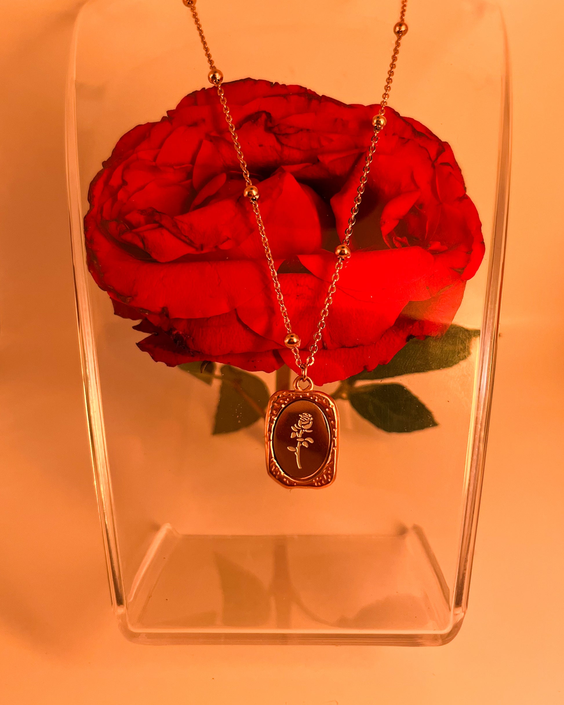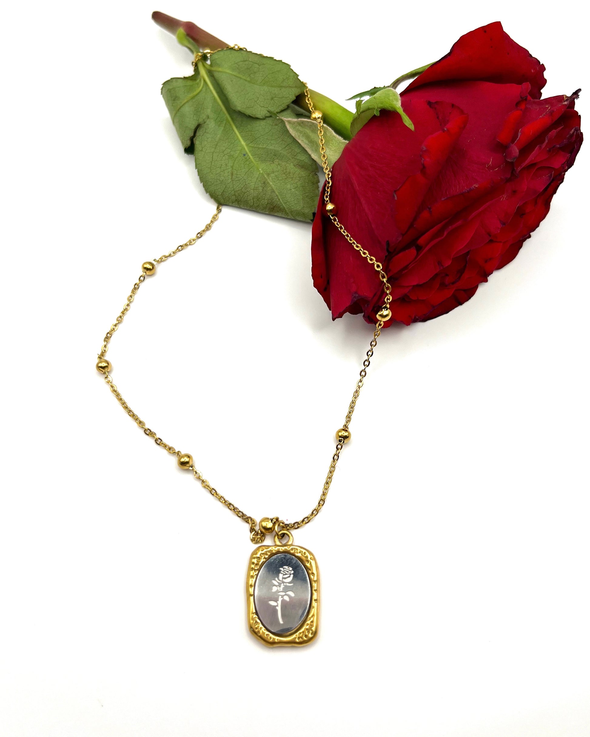 Le collier à pendentif doré Rosa est conçu en acier inoxydable plaqué or 18 carats, une matière résistante qui ne ternit pas et qui est hypoallergénique.