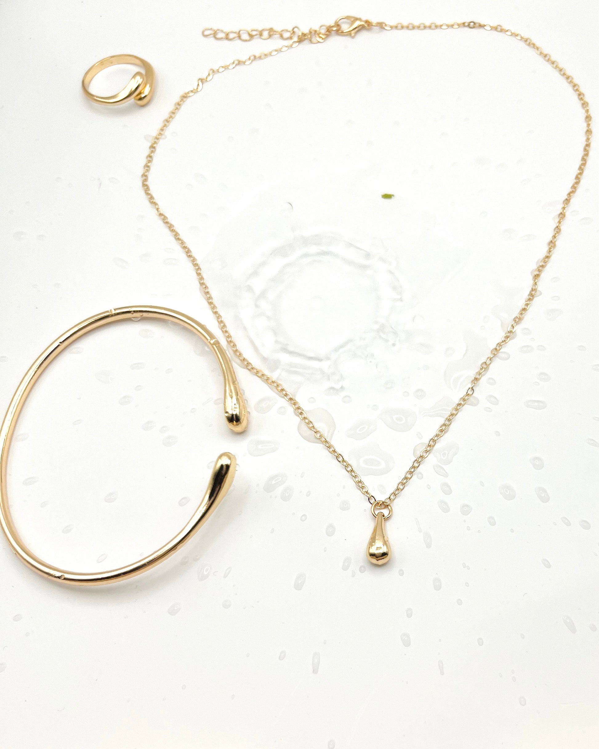 L´ensemble de bijoux doré Goccis d’Acqua est conçu en alliage de Zinc, une matière rigide résistante à la torsion.